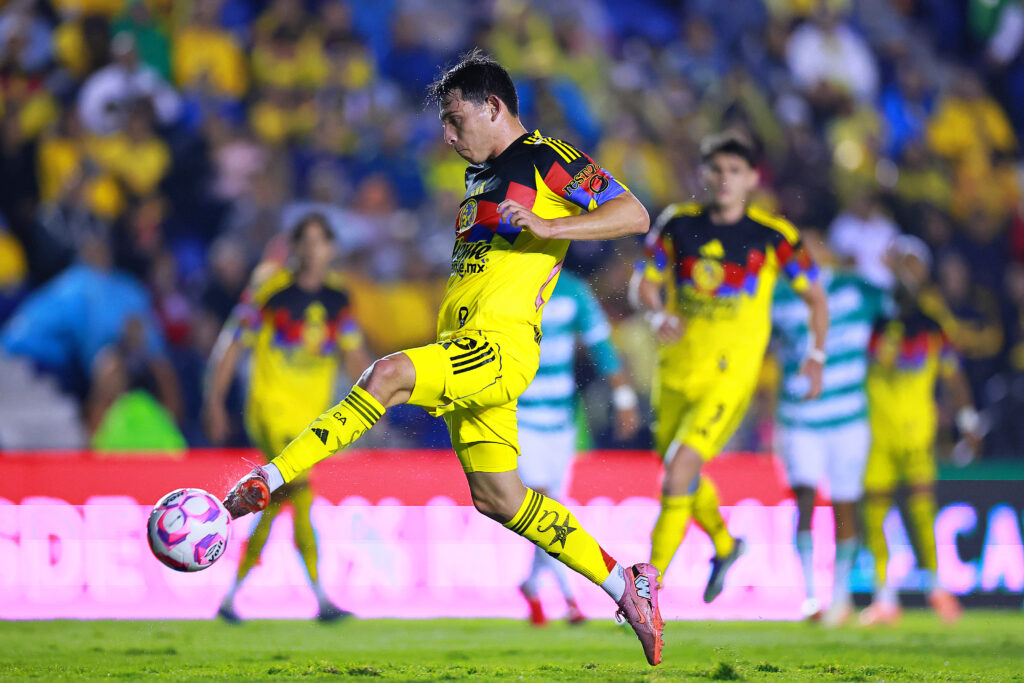 MEXICO CITY, MEXICO - OCTOBER 04: Alexis Gutierrez of America kicks the ball during the 12th round match between America and Santos Laguna as part of the Torneo Apertura 2025 Liga MX at Estadio Ciudad de los Deportes on October 04, 2025 in Mexico City, Mexico. (Photo by Manuel Velasquez/Getty Images)
