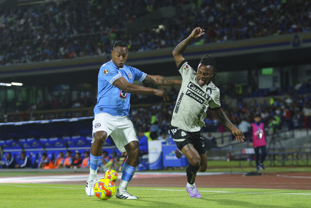 MEXICO CITY, MEXICO - MARCH 15: Willer Ditta of Cruz Azul fights for the ball with Jhon Murillo of San Luis during the 12th round match between Cruz Azul and Atletico San Luis as part of the Torneo Clausura 2025 Liga MX at Estadio Olimpico Universitario on March 15, 2025 in Mexico City, Mexico. (Photo by Agustin Cuevas/Getty Images)