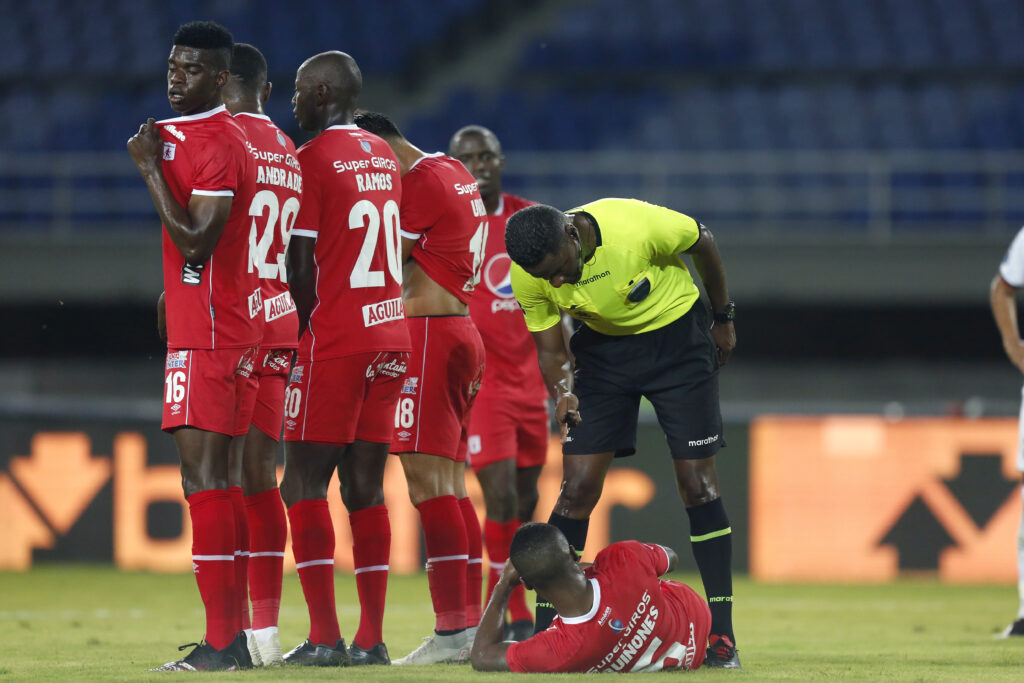 CALI, COLOMBIA - JULY 13: Referee José Argote talks to Héctor Quiñones of America de Cali during a round of sixteen match between America and Athletico Paranaense as part of Copa CONMEBOL Sudamericana 2021 at Estadio Hernán Ramírez Villegas on July 13, 2021 in Cali, Colombia. (Photo by Ernesto Guzman - Pool/Getty Images)