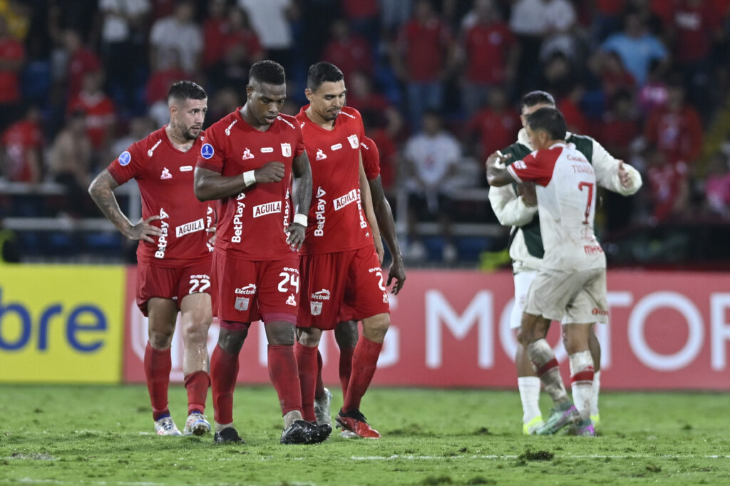 SANTIAGO DE CALI, COLOMBIA - MAY 14: Players of América de Cali look disappointed after Copa CONMEBOL Sudamericana Group C match between América de Cali and Huracán at Estadio Olimpico Pascual Guerrero on May 14, 2025 in Santiago de Cali, Colombia. (Photo by Gabriel Aponte/Getty Images)