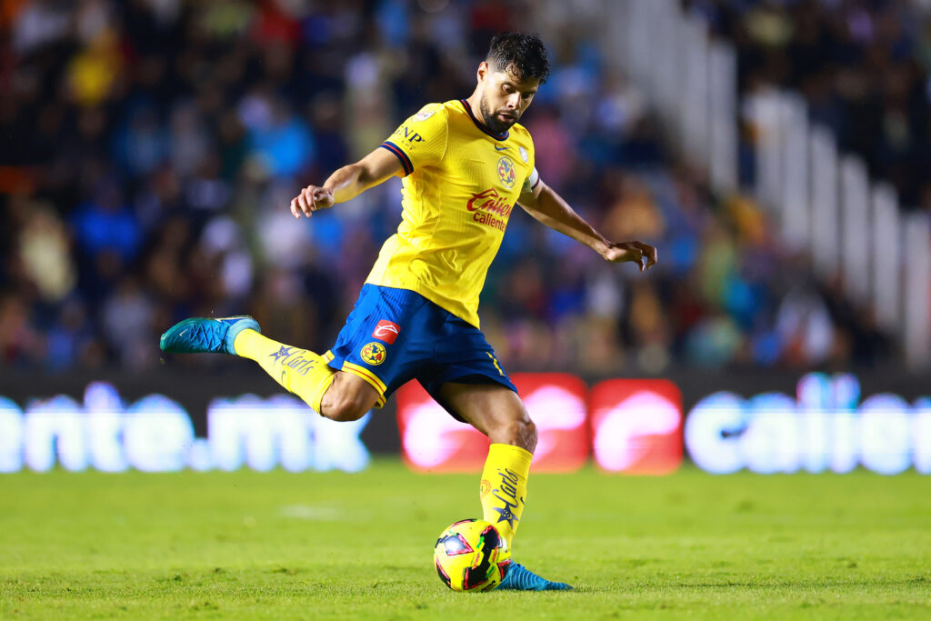 QUERETARO, MEXICO - JANUARY 10: Nestor Araujo of America kicks the ball during the 1st round match between Queretaro and America as part of the Torneo Clausura 2025 Liga MX at La Corregidora Stadium on January 10, 2025 in Queretaro, Mexico. (Photo by Hector Vivas/Getty Images)