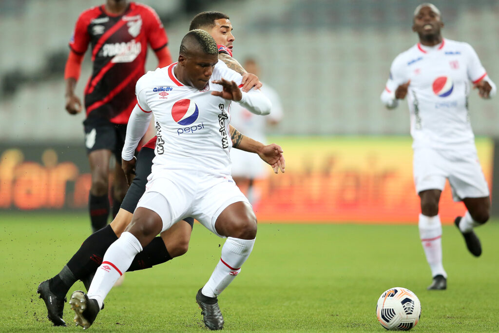 CURITIBA, BRAZIL - JULY 20: Marlon Torres of America de Cali competes for the ball with David Terans of Athletico Paranaense during a round of sixteen second leg match between Athletico Paranaense and America de Cali as part of Copa CONMEBOL Sudamericana 2021 at Arena da Baixada on July 20, 2021 in Curitiba, Brazil. (Photo by Heuler Andrey - Pool/Getty Images)