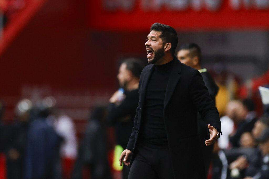 TOLUCA, MEXICO - OCTOBER 18: Benjamin Mora, head coach of Queretaro, gestures during the 13th round match between Toluca and Queretaro as part of the Torneo Apertura 2025 Liga MX at Nemesio Diez Stadium on October 18, 2025 in Toluca, Mexico. (Photo by Rodrigo Oropeza/Getty Images)