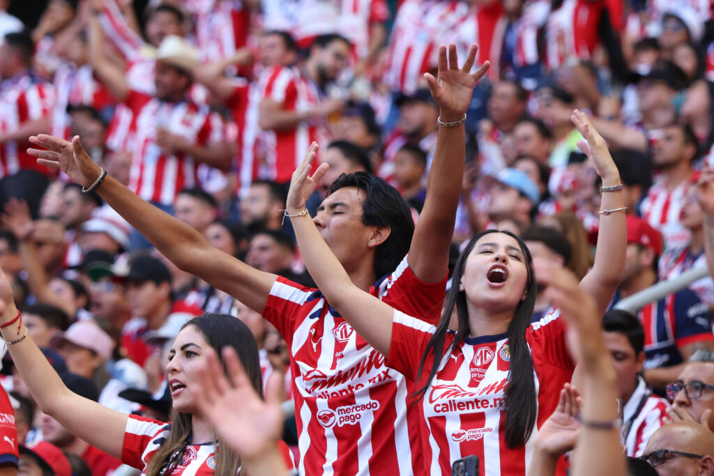 ZAPOPAN, MEXICO - JULY 26: Fans of Chivas celebrate during the 3rd round match between Chivas and Atletico San Luis as part of the Torneo Apertura 2025 Liga MX at Akron Stadium on July 26, 2025 in Zapopan, Mexico. (Photo by Simon Barber/Getty Images)