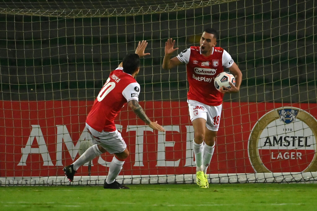 ARMENIA, COLOMBIA - APRIL 28: Daniel Giraldo (R) of Independiente Santa Fe celebrates with teammate Luis Seijas after scoring the first goal of his team during a match between Independiente Santa Fe and Fluminense as part Group D of Copa CONMEBOL Libertadores 2021 at Centenario Stadium on April 28, 2021 in Armenia, Colombia. (Photo by Juan Barreto - Pool/Getty Images)