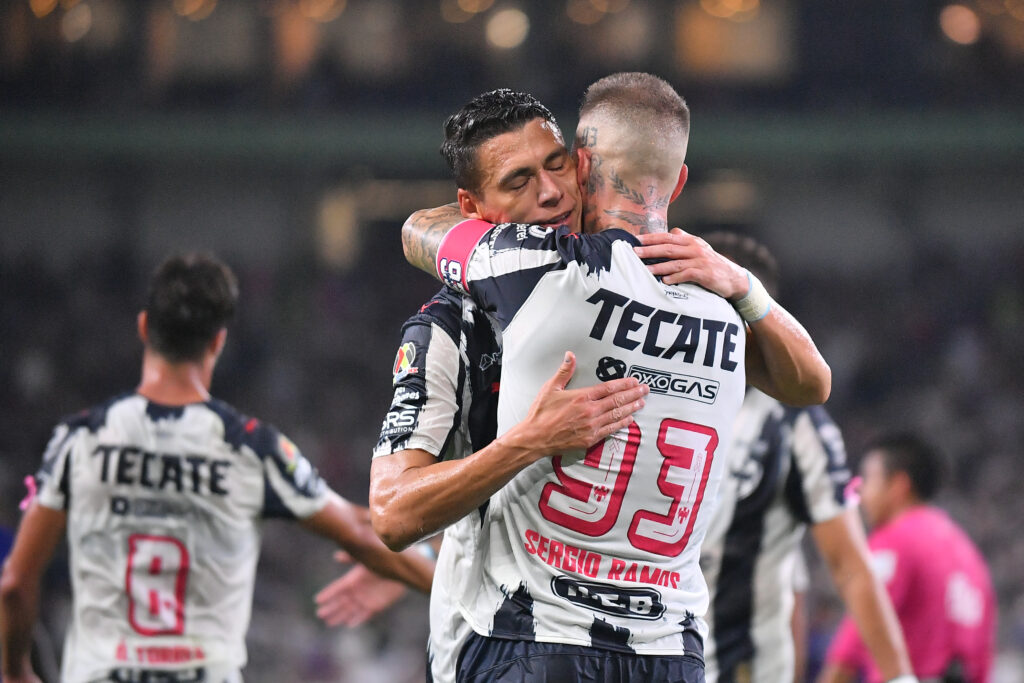 MONTERREY, MEXICO - OCTOBER 18: Sergio Ramos of Monterrey celebrates with teammate Hector Moreno after scoring the team's first goal via penalty during the 13th round match between Monterrey and Pumas UNAM as part of the Torneo Apertura 2025 Liga MX at BBVA Stadium on October 18, 2025 in Monterrey, Mexico. (Photo by Azael Rodriguez/Getty Images)