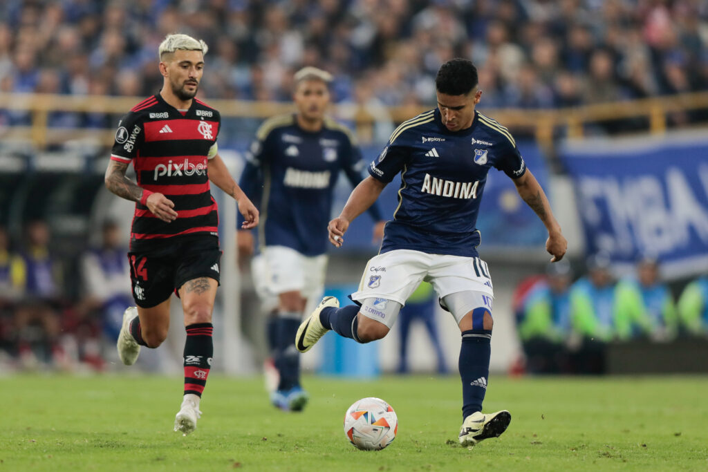 BOGOTA, COLOMBIA - APRIL 2: Daniel Cataño of Millonarios F.C competes for the ball with De Arrascaeta of Flamengo during a match between Millonarios F.C and Flamengo as part of Copa CONMEBOL Libertadores 2024 at Estadio El Campin on April 2, 2024 in Bogota, Colombia. (Photo by Andres Rot/Getty Images)