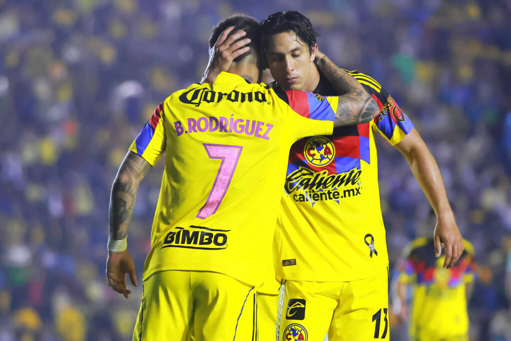 MEXICO CITY, MEXICO - OCTOBER 04: Brian Rodriguez of America celebrates with teammate after scoring the team's second goal during the 12th round match between America and Santos Laguna as part of the Torneo Apertura 2025 Liga MX at Estadio Ciudad de los Deportes on October 04, 2025 in Mexico City, Mexico. (Photo by Manuel Velasquez/Getty Images)