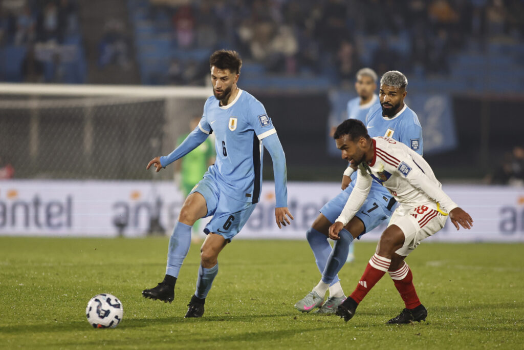 MONTEVIDEO, URUGUAY - JUNE 10: Rodrigo Bentancur of Uruguay passes whilst under pressure from Cristian Cásseres of Venezuela during the FIFA World Cup 2026 South American Qualifier match between Uruguay and Venezuela at Estadio Centenario on June 10, 2025 in Montevideo, Uruguay. (Photo by Ernesto Ryan/Getty Images)