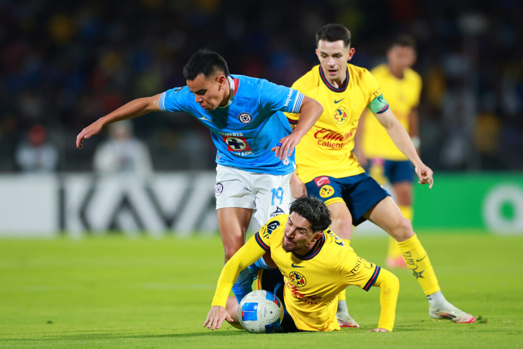 MEXICO CITY, MEXICO - APRIL 08: Carlos Rodriguez of Cruz Azul battles for possession with Diego Valdes of America during the 2025 Concacaf Champions Cup match between Cruz Azul and America at Olimpico Universitario Stadium on April 08, 2025 in Mexico City, Mexico. (Photo by Hector Vivas/Getty Images)